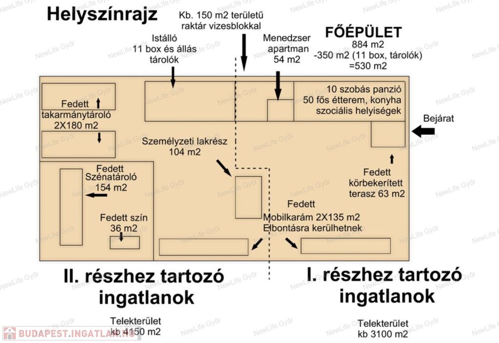 II. rész irányára: 194 MFt, mely tartalmazza a főépület végét, kb 350 m2-nyi, 11 boxot és állást, tárolókat, 2*180 m2 fedett takarmánytárolót, 154 m2 fedett szénatárolót, 34 m2 méretű fedett színt és egy személyzeti komplett lakrészt 104 m2en. A főépülettel szemben található (másik) 135 m2 területű fedett mobilkarám, mely szükség esetén bontható, vagy autóbeállók alakíthatók ki belőle.