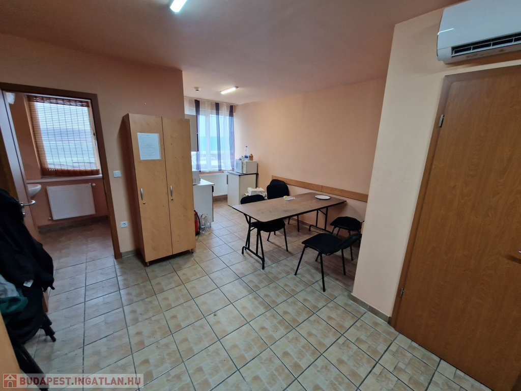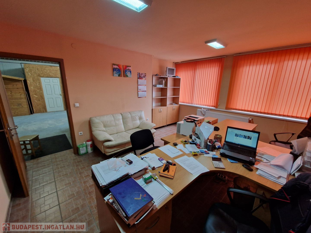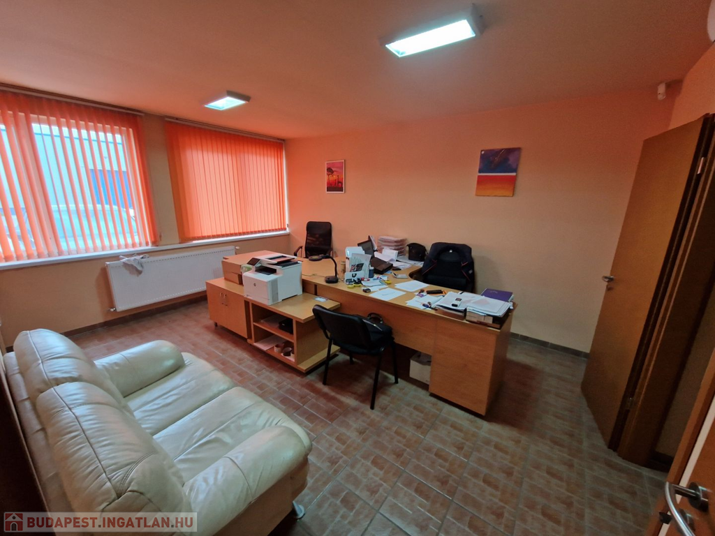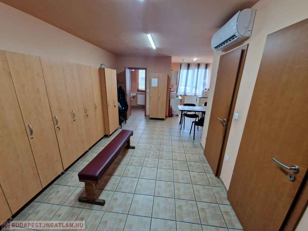 Csarnokon belül került kialakításra 100m2 területen iroda, öltöző, konyha, zuhanyzó és mellékhelyiségek. A csarnok az elmúlt években teljes felújításon és korszerűsítésen esett át. Tető kívülről plusz trapézlemez héjazatot kapott, belülről üveg gyapot szigetelést és szintén trapézlemezzel burkolt. A csarnok belmagassága 3-5m . A szomszédoktól elválasztó oldalfalak 8cm vastagságú szendvicspanellel vannak szerelve. . Az aljzat nagy teherbírású 15 + 20cm-es acélhálóval erősített festett beton. Személybejárós ipari kapu mérete 3,4 x 4,2 m ( szé x ma) . A TELJES épület hűtéséről és fűtéséről inverteres klímák gondoskodnak. A rendelkezésre álló áramerősség 3 x 80A.
