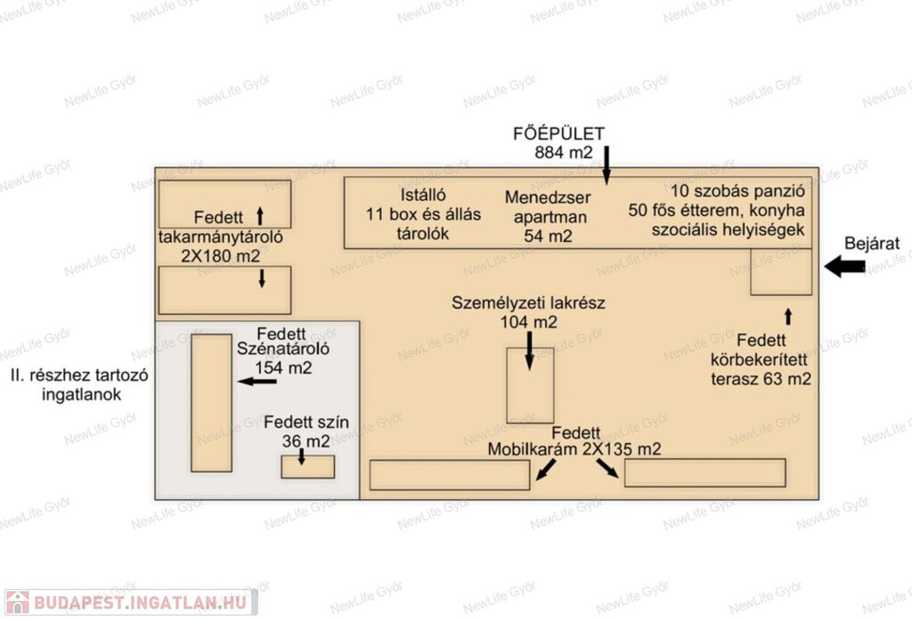 II. rész irányára: 380MFt, mely hatalmas területet: 94226 m2 telekrészt tartalmaz, illetve a 966 m2 területű, acél vázszerkezetű fedeles lovardát továbbá többek között szénatárolót, fedett kis istállót.