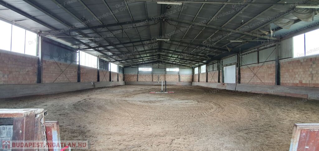 966 m2-es csarnok/fedeles lovarda, magasított nézőtérrel, tégla oldalfallal, acél vázszerkezettel, lemeztetővel
