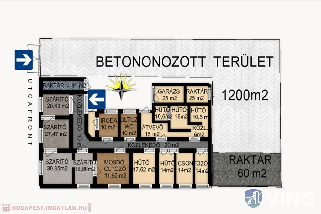 - 362 nm-en ipari beton aljzattal, több helyiségben hidegburkolattal, 3 m belmagasságú raktárokat, öltözőket, hűtőházakat alakítottak ki.