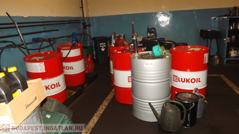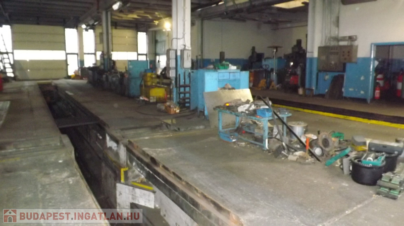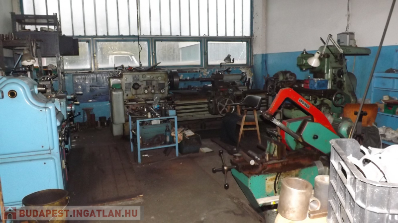 A műhelyben: 4,5m a belvilág, 38 m hosszú, tehergépjárművek javítására kialakított 3,5 beállás található, ebből 2 akna, fékpad, emelők, esztergályos és lakatos műhely kialakítva, raktárak, mosdó, wc, Scandoor kapuk , gáz sötétsugárzó fűtés.