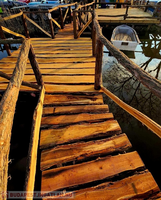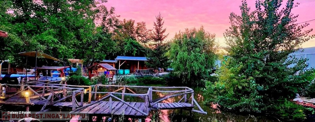 Halastó (20×40 m, 2–2,5 m mély), stég, terasz, medence
