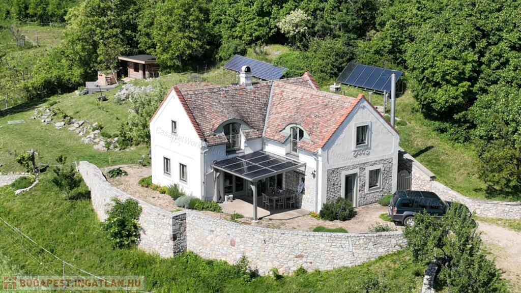 A 2015-ben épült, majd 2020-ban teljeskörűen felújított, nagyon hangulatos, két szintes családi ház hatalmas terasszal, nagy, száraz boltozatos pincével rendelkezik. A telken továbbá található egy panorámás kerti szauna fürdődézsával, egy kerti tó és sok-sok termő gyümölcsfa.