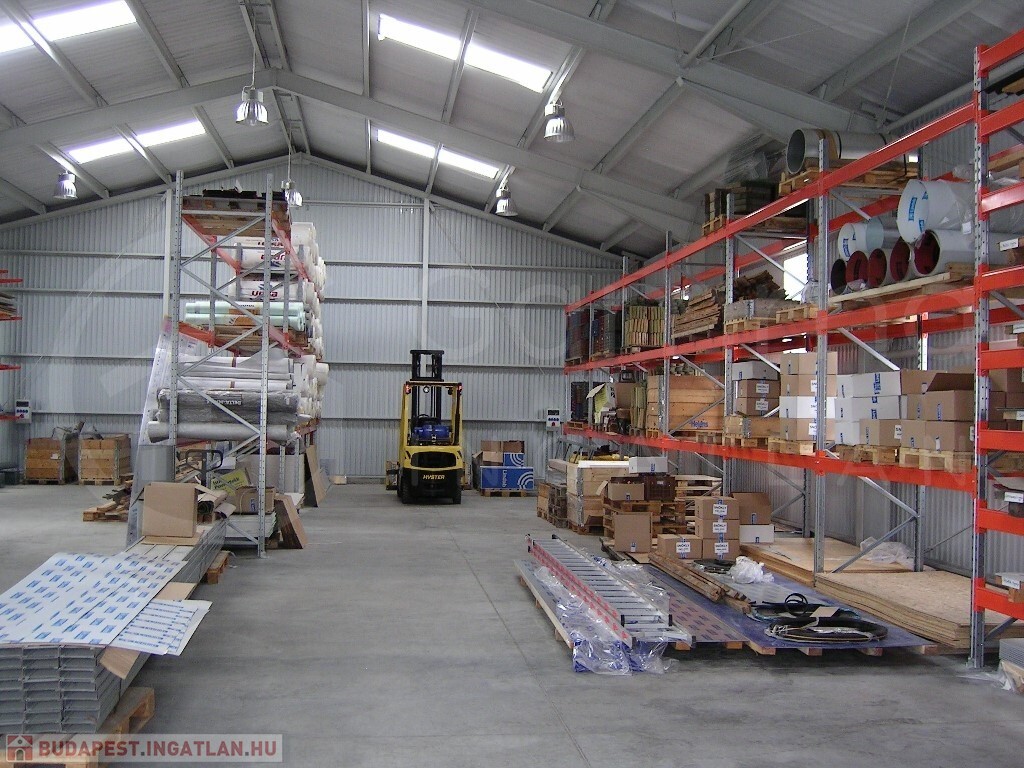 A raktárépület ipari padlóval és magas polcrendszerrel rendelkezik.