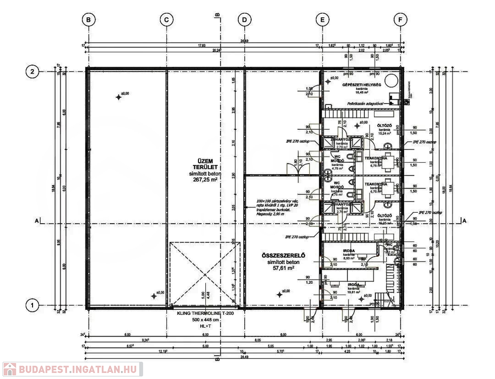 Az acélvázas csarnok, műanyagbevonatos horganyzott acél trapézlemez tetőfedést kapott. Szigetelése - 12 cm vastagságú - NOBASIL tipusú kőzetgyapot. A csarnokrész burkolata színes, műanyag bevonatos, horganyzott acél trapézlemez (LTP20). A műanyag nyílászárók 2 régetű üvegezésűek, hőszigeteltek. Az ipari padló vasalt aljzatbeton(C25-24/KK). A fűtésről Beretta típusú kazán gondoskodik, puffertartállyal ellátva, radiátor hőleadókon keresztül. Áramellátottság 3x63A és 15kW-os napelemrendszerrel.