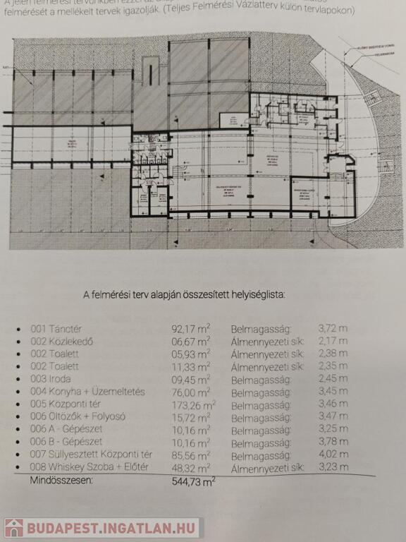 Az ingatlan-nyilvántartásban 458 nm bejegyzett hasznos alapterület a valóságban a pontos mérések alapján 545 nm, ami több kisebb szinteltolással több részre tagolja a helyiséget (lásd helyiséglista a fotók között). Jelenleg 3 nagyobb rész van kialakítva, ezek mellett több kisebb helyiség és szociális blokk található. Mivel a födémszerkezet betonpilléren nyugszik, ezért minden válaszfal bontható, az elrendezés alakítható. Az ingatlan teljes belső felújítást igényel. Az épületről készült statikai tanulmányt komoly érdeklődés esetén az érdeklődő rendelkezésére bocsájtjuk.