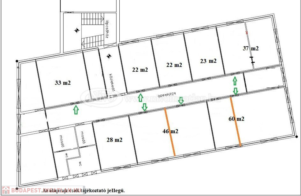 Az emeleten egészen ~22 m2-től ~60 m2-ig vannak még eladó irodák, üzlethelyiségek. Egyes irodákban vízvételi lehetőség is biztosított.