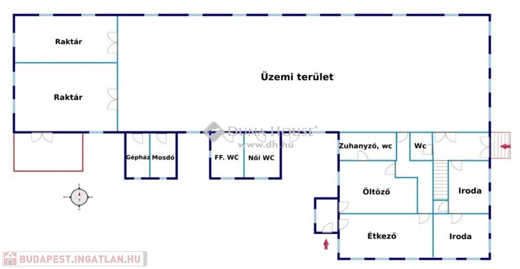 -az 1710 m2 felépítmény magába foglalja a 1090 m2-es üzemet, 180 m2-en raktárakat, 5 db irodát 120 m2-en, a fennmaradó 320 m2-en szociális helyiségeket ( öltöző, mosdók, wc-k, étkező) találunk