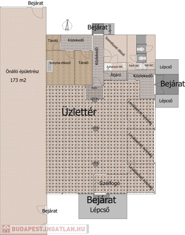 A fő épülethez csatlakozik még egy önálló bejáratú, különállóan használható, egyterű 173 m2-es épület.