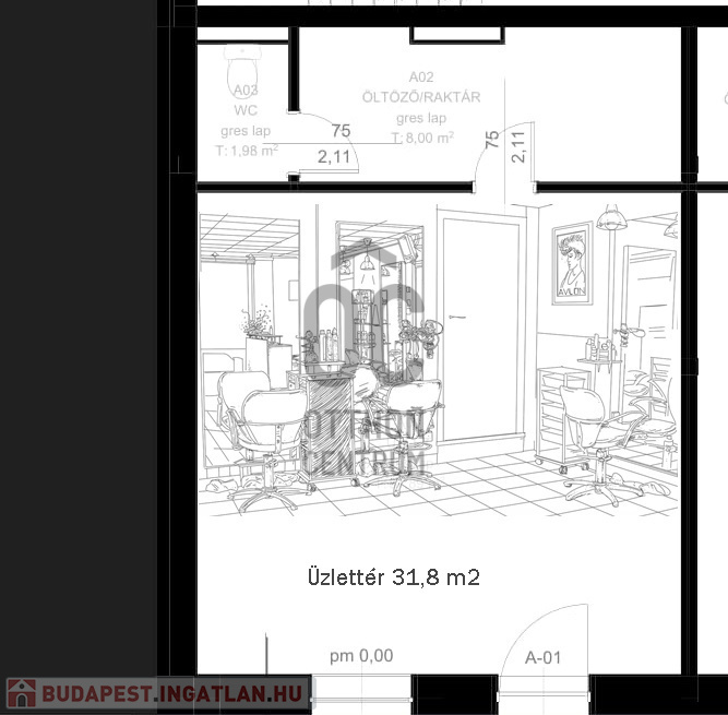 - üzlettér 31,8 m2+ kiszolgáló helyiségek