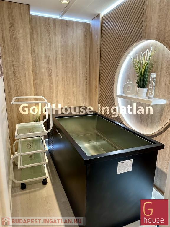 Az emeleten egy teljes értékű fürdőszoba (mosdóval és zuhanyzóval), egy praktikus teakonyha, egy exkluzív kozmetikai helyiség, egy kezelőszoba, egy külön iroda-tárgyaló egység, valamint egy kényelmes öltöző került kialakításra, mindez prémium minőségű anyaghasználattal és igényes belsőépítészeti megoldásokkal.