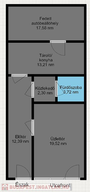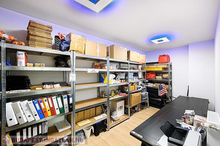 Jelenlegi elosztása alapján megtalálható benne egy 12 nm-es előtér, egy hűtő-fűtő klímával felszerelt 19,5 nm-es üzlettér, egy 3,7 nm-es fürdőszoba, egy kis közlekedő és egy jelenleg tárolóként kialakított 13 nm-es helyiség, ahol a konyhai kiállások előkészítésre kerültek, így könnyen átalakítható akár lakásnak is.