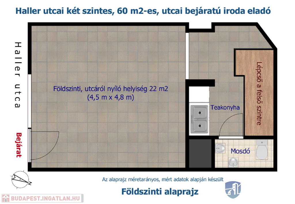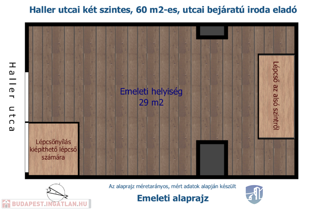 A 31 m2-es földszinten UTCÁRÓL NYÍLÓ, VILÁGOS IRODAHELYISÉG, valamint egy teakonyha és mosdó áll rendelkezésre. A 29 m2-es, szintén ablakos felső szintre – az alaprajz szerinti kiépítésben – belső lépcső vezet, mely akár az iroda elejébe is áthelyezhető.