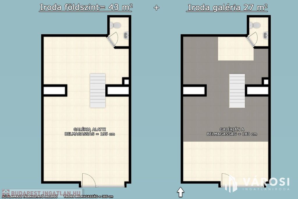 Az alapterületet (43 m2), amit egy fém szerkezetű, masszív álló galériával növelték meg, ahol további 27 m2 hely jut irodának, vagy éppen raktározásra. A galéria utca felöli részén üvegfal biztosítja a földszintre rálátást és a természetes fényt.