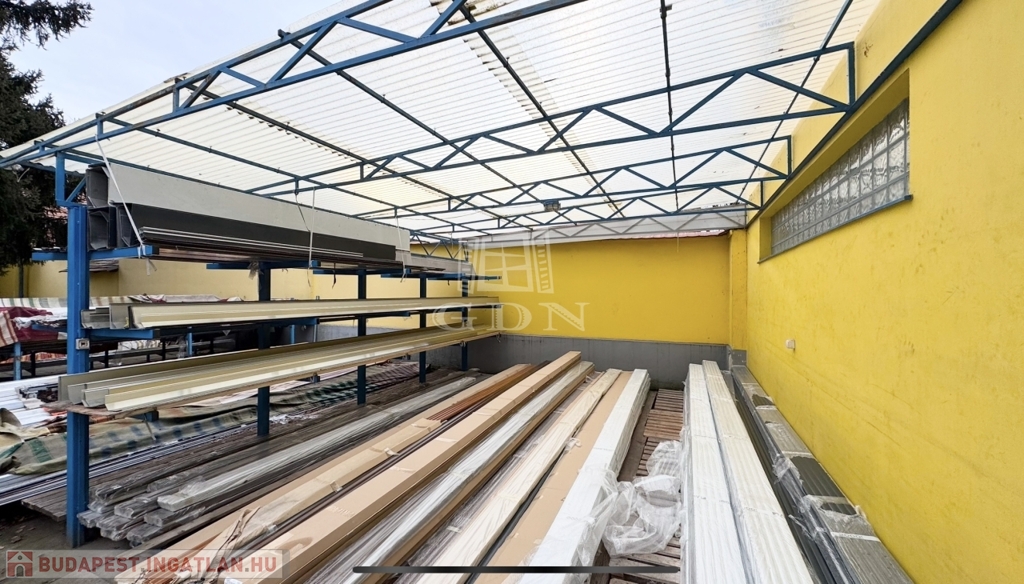 • Épület: Az utcafronti, földszintes épület oldalhatáron helyezkedik el, jelenleg árnyékolástechnikai vállalkozás működik benne. Az udvar hátsó része (körülbelül a telek fele) acélszerkezetű, polikarbonát héjalású tetővel fedett, amely ideális raktározási célokra.