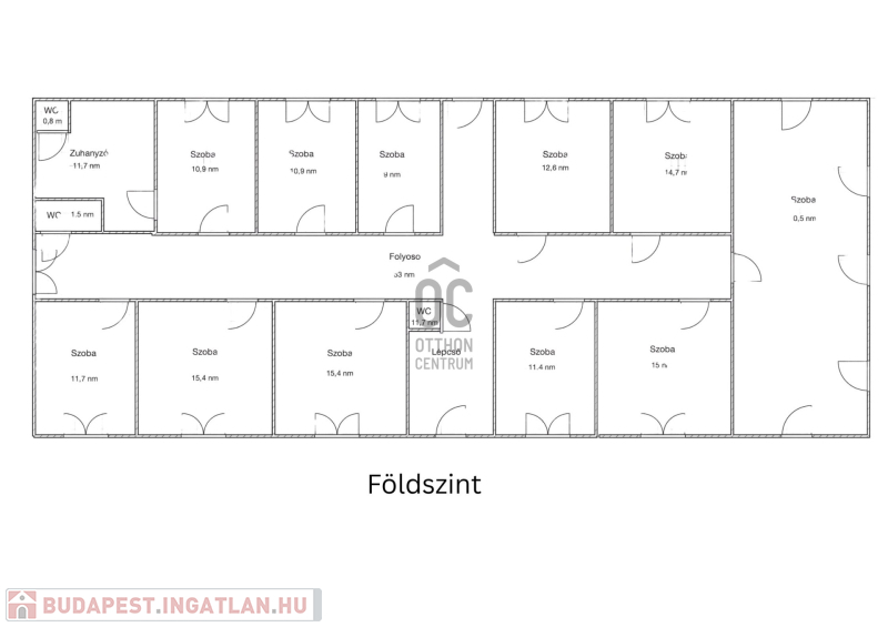 Az épület földszinti része 234 m², 10 irodával, mellékhelyiségekkel és tágas folyosóval.