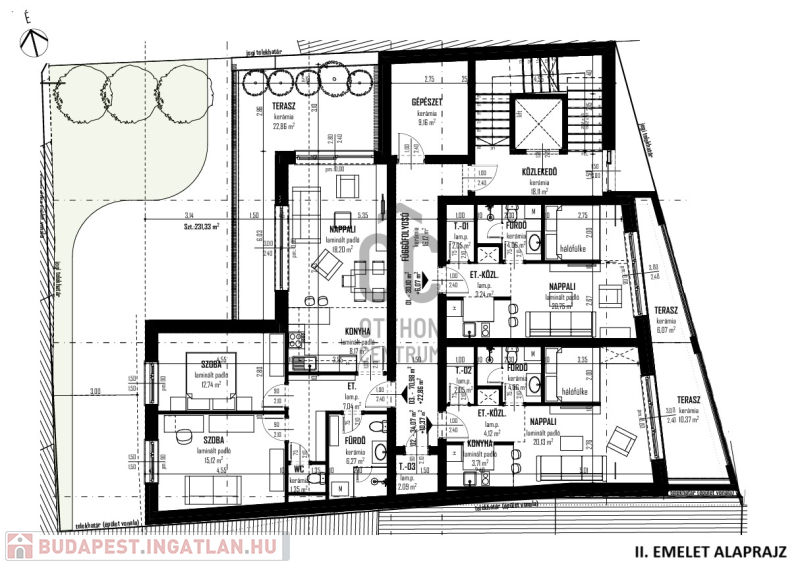 Az I. és II. emeletén 3 - 3 lakás, melyek garzon (nappali + hálófülke) és nappali + 2 hálós kialakításuak.