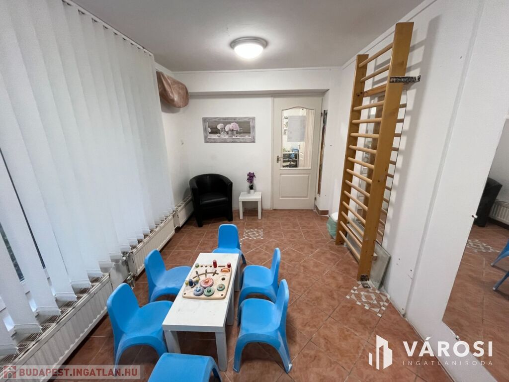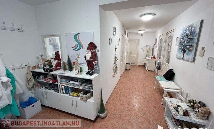 A helyiség praktikus elrendezéssel rendelkezik, három kezelőhelyiséggel, váróval, három mosdóval, teakonyhával minden igényt kielégít.