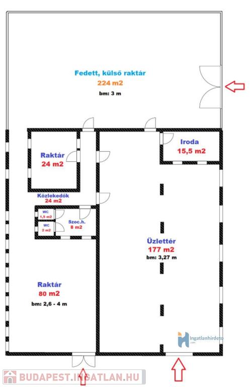 Az ingatlan magába foglal egy nettó 332 m2-es épületet + egy 224 m2-es, szendvicspaneles, külső raktárat + egy 30 m2-es pince helyiséget + több külső parkolót is, melyek az üzlethez tartoznak