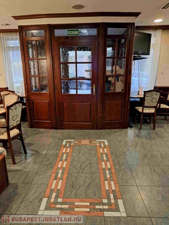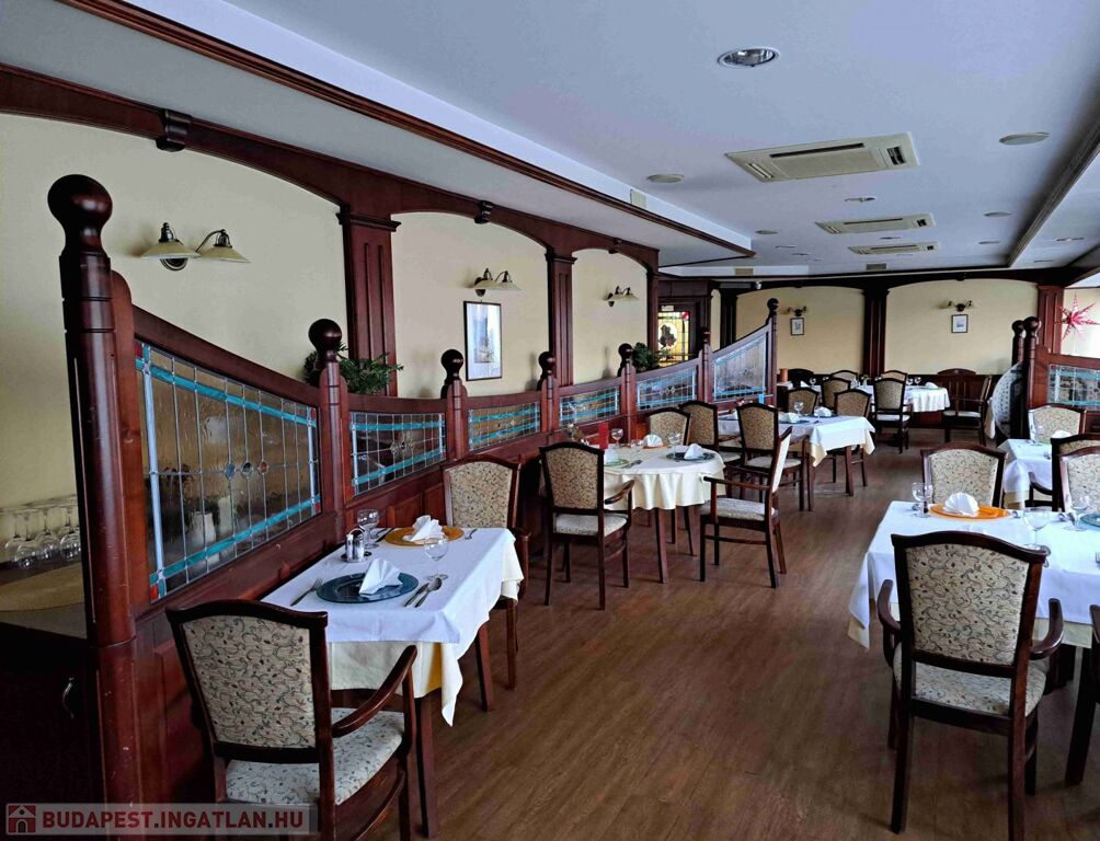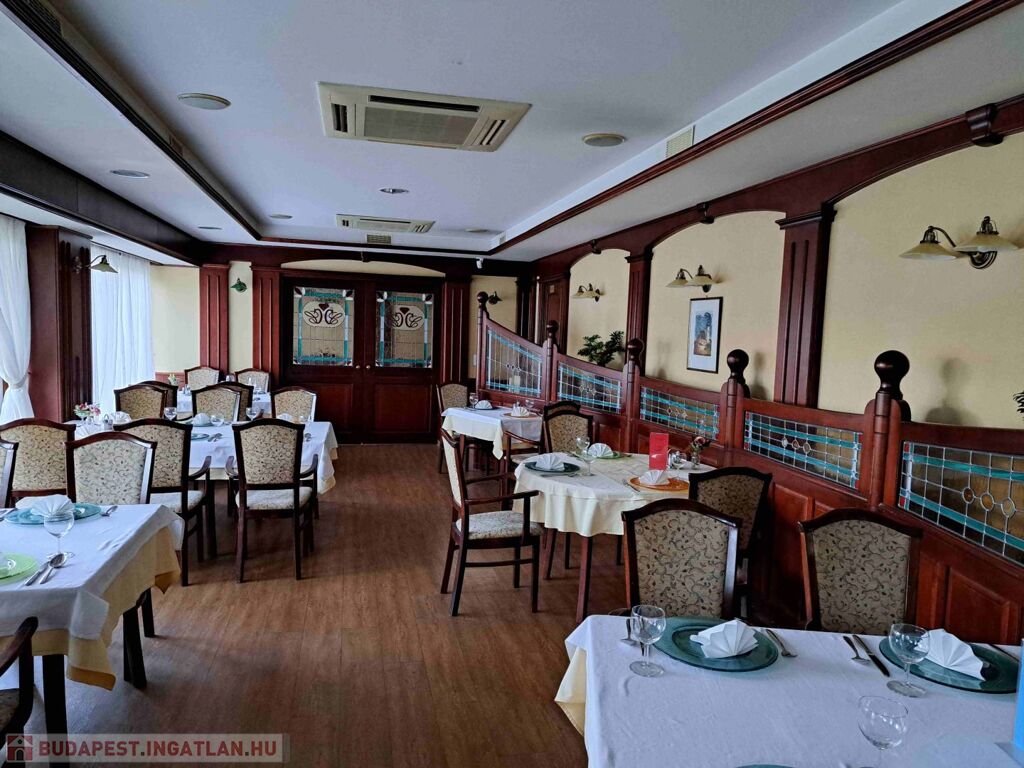 A belső kialakítás és elrendezés nagyon magas szinvonalú., kétoldali nagy üvegfelületekkel. Az eladó-kiszolgáló tér és konyha minden jogszabályi követelményeknek megfelel és fel van szerelve. Rendelkezik teljesen elszeparálható különteremmel ( szivarszobáva ), amihez külön vizesblokk is tartozik. Egyidőben akár 75 fő színvonalas kiszolgálása is lehetséges. Az étteremhez ( üzlethelységhez) tartozik 9 db zár udvari gépkocsibeálló is, ami egy távvezérléses kapu közelíthető meg.