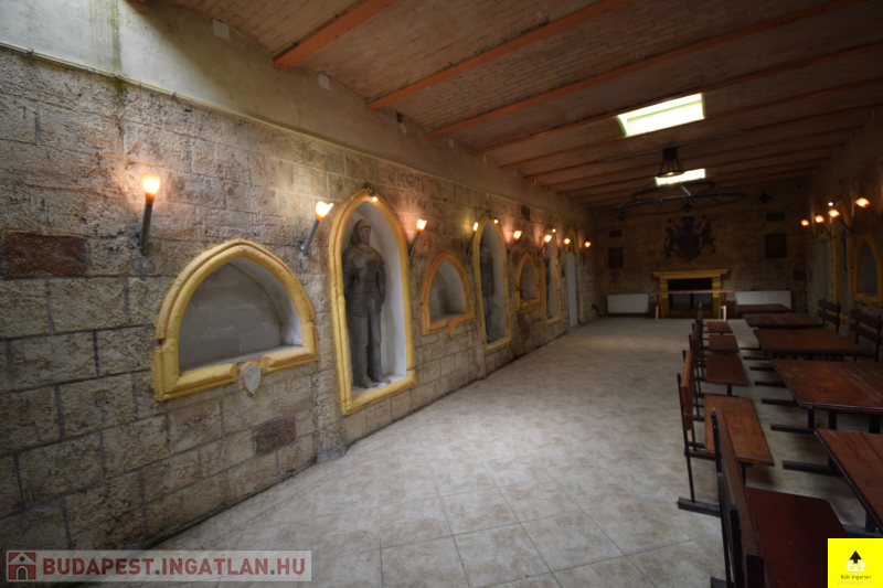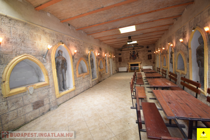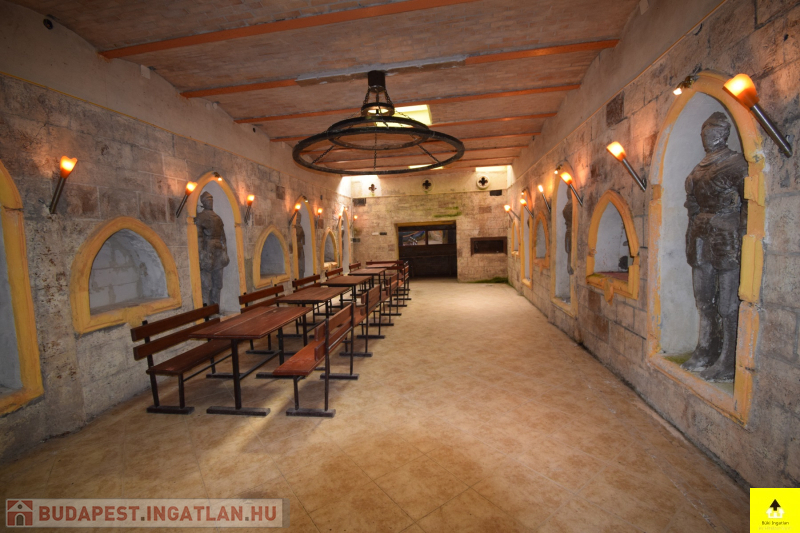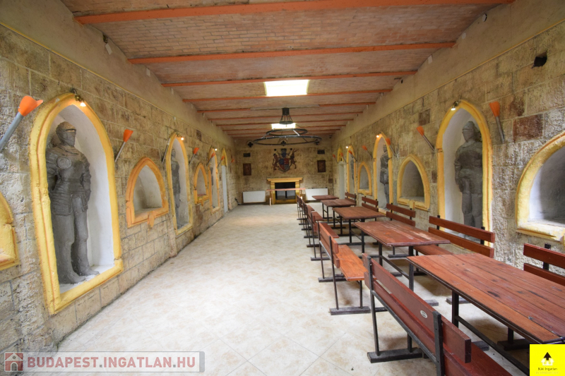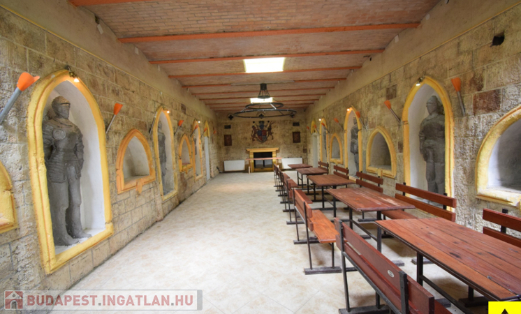 Különleges hangulatú, autentikus lovagterem: ódon páncélos szobrok, zászlók, fáklyák, trónszékek, kovácsoltvas csillárok – középkori miliő