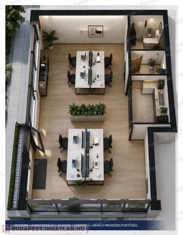 Győr egyik legkeresettebb városrészében, Nádorvárosban, egy modern, 15 lakásos társasház földszintjén kínálunk megvételre egy 48,22 nm-es, DK-i tájolású, utcafronti irodát. A hatalmas üvegportálnak köszönhetően egész nap világos, így tökéletes választás saját célra, kiadásra vagy biztos, értékálló befektetésként.