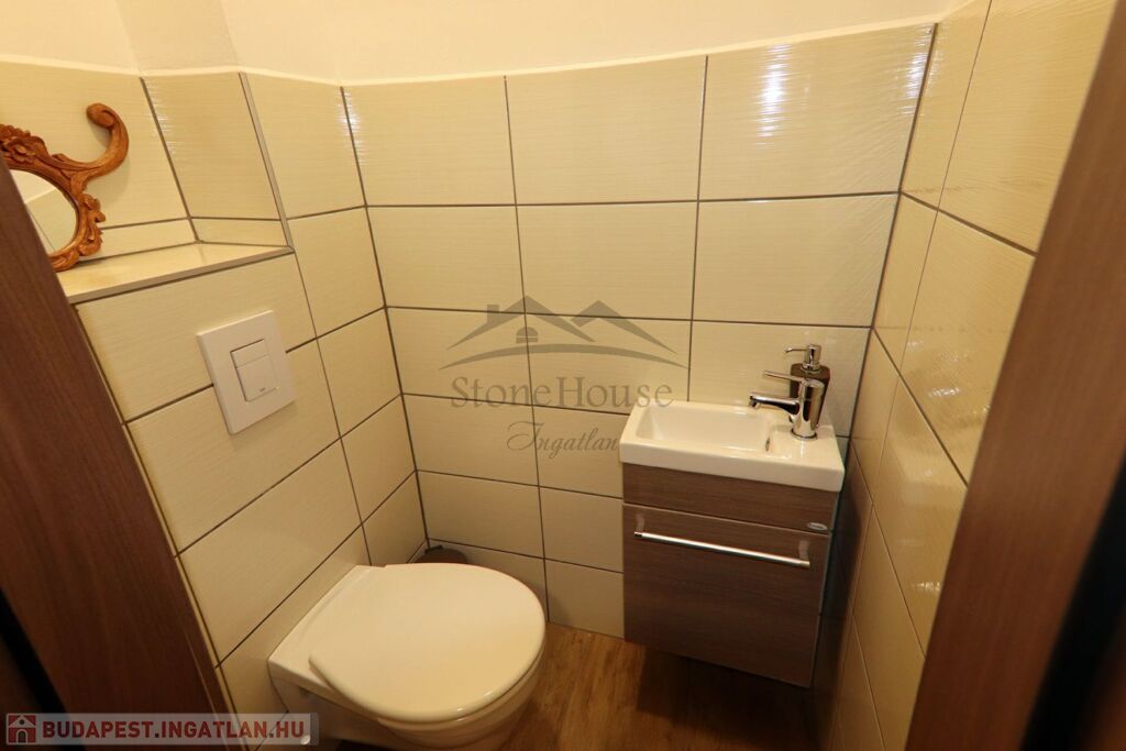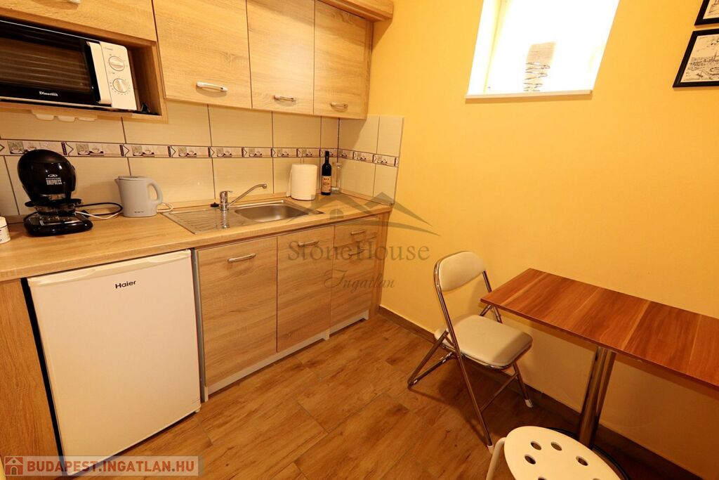 A konyha jelenleg az egyik fürdőszobában került kialakításra, de visszaállítható az eredeti állapot, mivel minden lefolyó és vezeték a helyén van. Akár ebből további irodai helyiség is kialakítható.