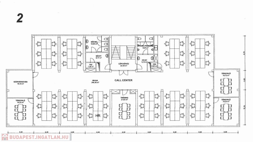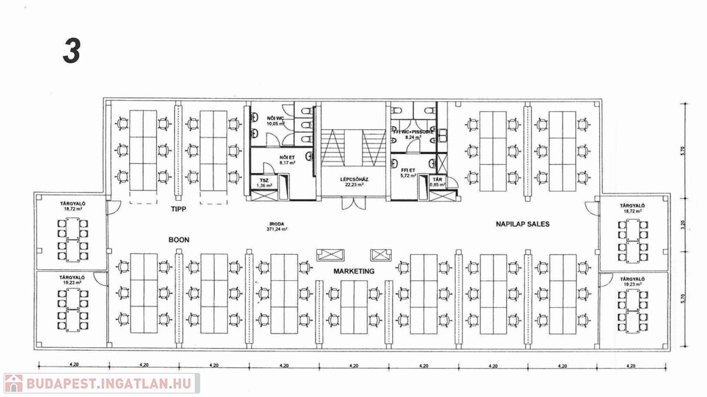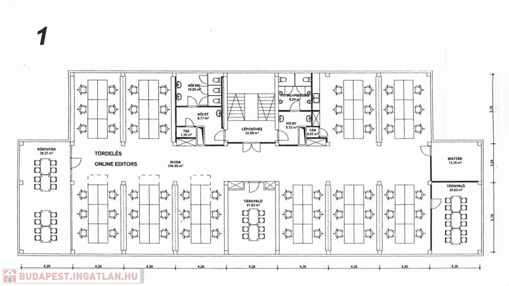 Alapterülete tulajdoni lap szerint 506 m², ezen a területen kialakított irodák összes hasznos alapterülete 2591 m².