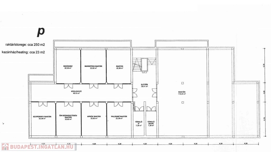 Telek terület 2461 m², amin egy 644 m² -es vasbeton tartószerkezetes, egy légterű, csarnok található, amit úgy alakítottak ki, hogy a tartó oszlopok között, egymástól független, szekcionált garázskapukon keresztül lehet a csarnokba bejutni.