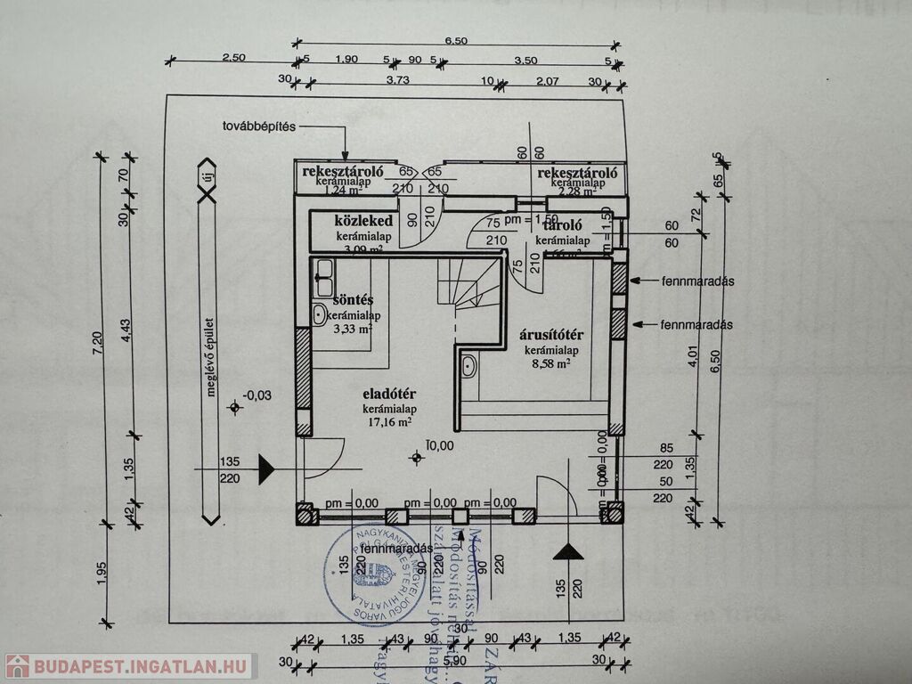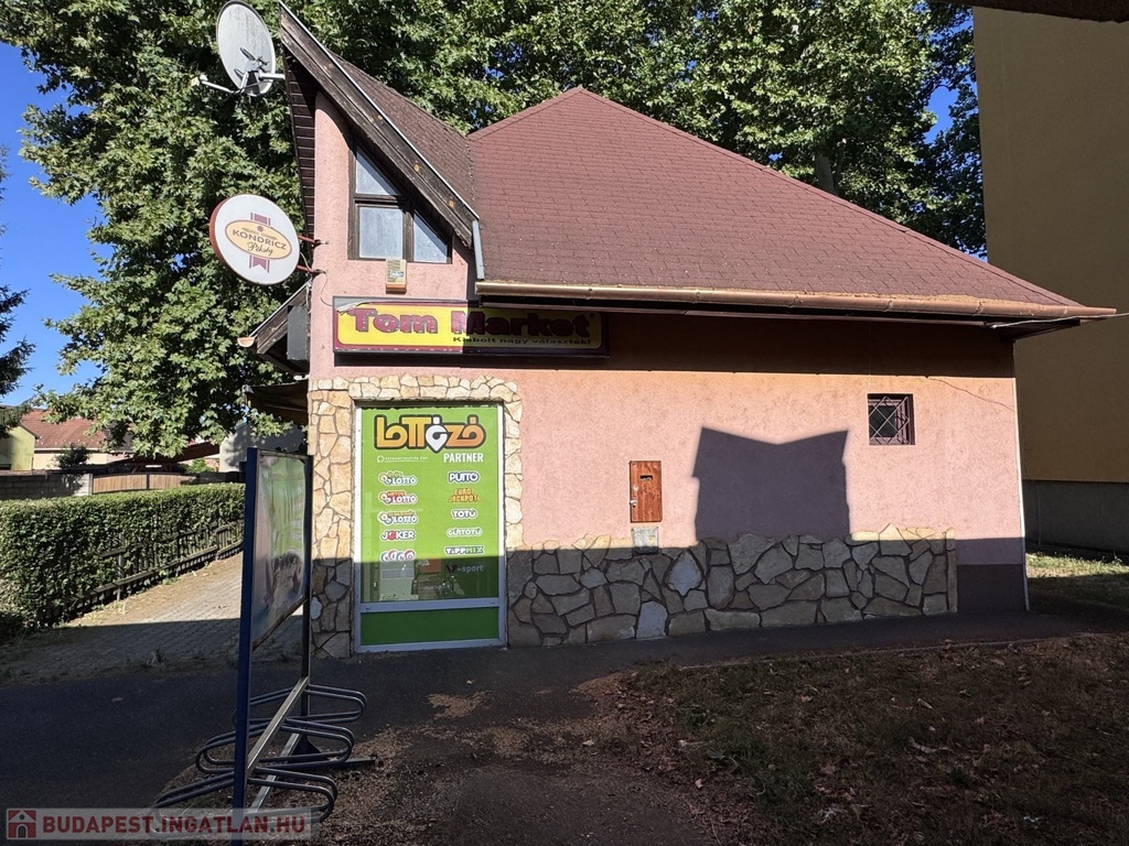Helyiségek: eladótér, árusítótér, kiszolgálótér, 2 raktár, tetőtérben kiszolgálótér, 2 külön Wc mosdóval, tároló.