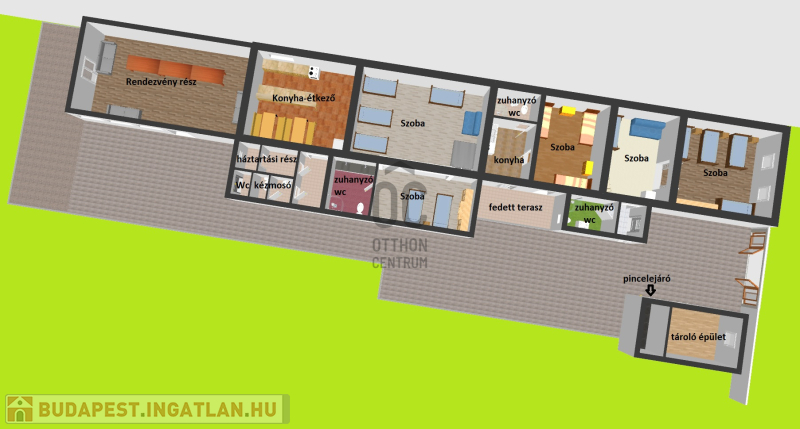 •Jelenlegi funkció: társalgó / rendezvényhelyiség, de akár külön lakóegységként vagy vállalkozási célra is kiválóan hasznosítható.