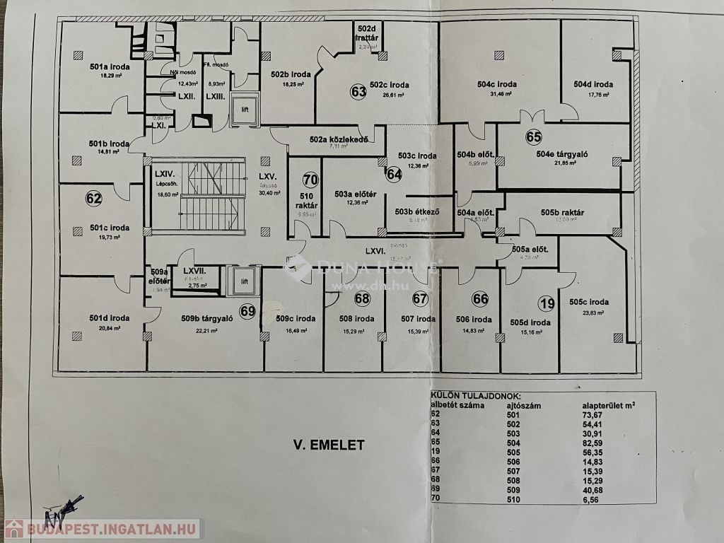 A jelen hirdetés a 74 m2-es, 4 helyiségből álló irodára vonatkozik, melyet az emelet rajzon 62-as számmal jelölünk. Az iroda napfényes, nagyon világos, panorámás, bútorozott és légkondicionált.