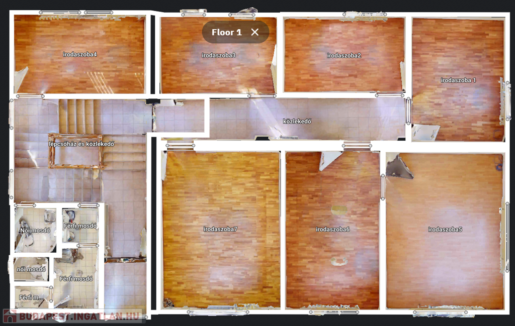 -Belső elrendezés: 10 külön irodahelyiség, szerver szoba, konyha, külön férfi és női mosdók, zuhanyzó és WC