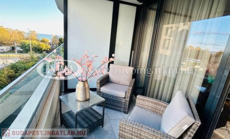 Alsóörsön, partközeli, Balatoni-rálátással, igényes, exkluzív, medencés, 2022-ben épült liftes társasházban, tégla lakás nagy méretű terasszal és teljes, komplett berendezéssel eladó.