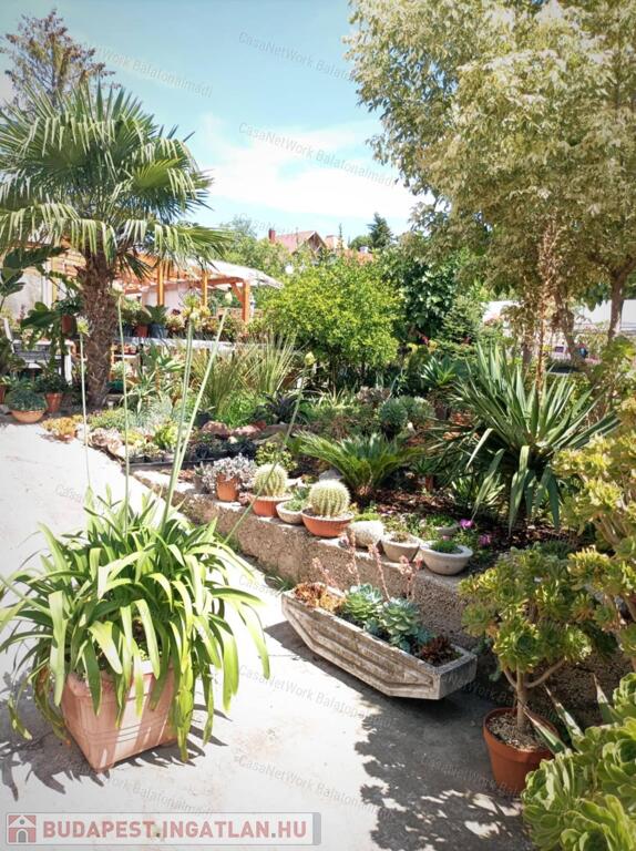 - sík, mediterrán növényekkel gazdagon telepített kert, árnyékot adó fákkal, bokrokkal, több autó számára is alkalmas parkolóhellyel