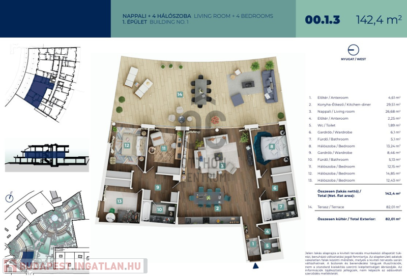 Az ingatlanpiac legújabb gyöngyszeme várja Önt és családját! Ez a kiváló állapotú, új építésű lakás ideális választás mindenki számára, aki a modern életstílust és a prémium kivitelezést keresi. Az ingatlan alapterülete 142m2, amely négy tágas szobát kínál hatalmas nappalival, továbbá két tágas gardróbbal, így bőven elegendő helyet biztosít a családi élethez. A 82m2-es terasz tökéletes helyszín a pihenésre és a szabadban eltöltött időre. A lakás minimalista kialakítása és világos, barátságos terei azonnal magukkal ragadják az érdeklődőket. Az ingatlan okos otthon rendszerrel van felszerelve, amely lehetővé teszi a modern technológiák egyszerű és kényelmes használatát. Az elektromos (fan-coil) fűtés-hűtés gondoskodik a maximális komfortérzetről, míg az automata öntözőrendszer a kert szépségét megőrzi. A lakópark, amelyben az ingatlan található, exkluzív környezetet biztosít, és a csendes, rendezett kertje a nyugalom szigetét nyújtja a város forgatagában. A medence lehetőséget ad a családok számára a közös időtöltésre, míg a portaszolgálat biztonságot és kényelmet nyújt. Az ingatlan közlekedési csomópont közelében helyezkedik el, így a város tömegközlekedési lehetőségei könnyen elérhetők. A környék ellátottsága kiváló, hiszen a közelben találhatóak bolt, iskola, óvoda és orvosi rendelő, így minden szükséges szolgáltatás könnyedén elérhető. A biztonságos és csendes környezet ideális helyszínt biztosít a családok számára, akik a nyugodt életet keresik. Egy ilyen egyedi tervezésű ingatlan nem mindennapi lehetőség, ezért érdemes mielőbb megtekinteni! Kérjük, ne habozzon felkeresni bennünket, amennyiben bármilyen kérdése van a lakással, lakóparkkal, vagy a környékkel kapcsolatban.