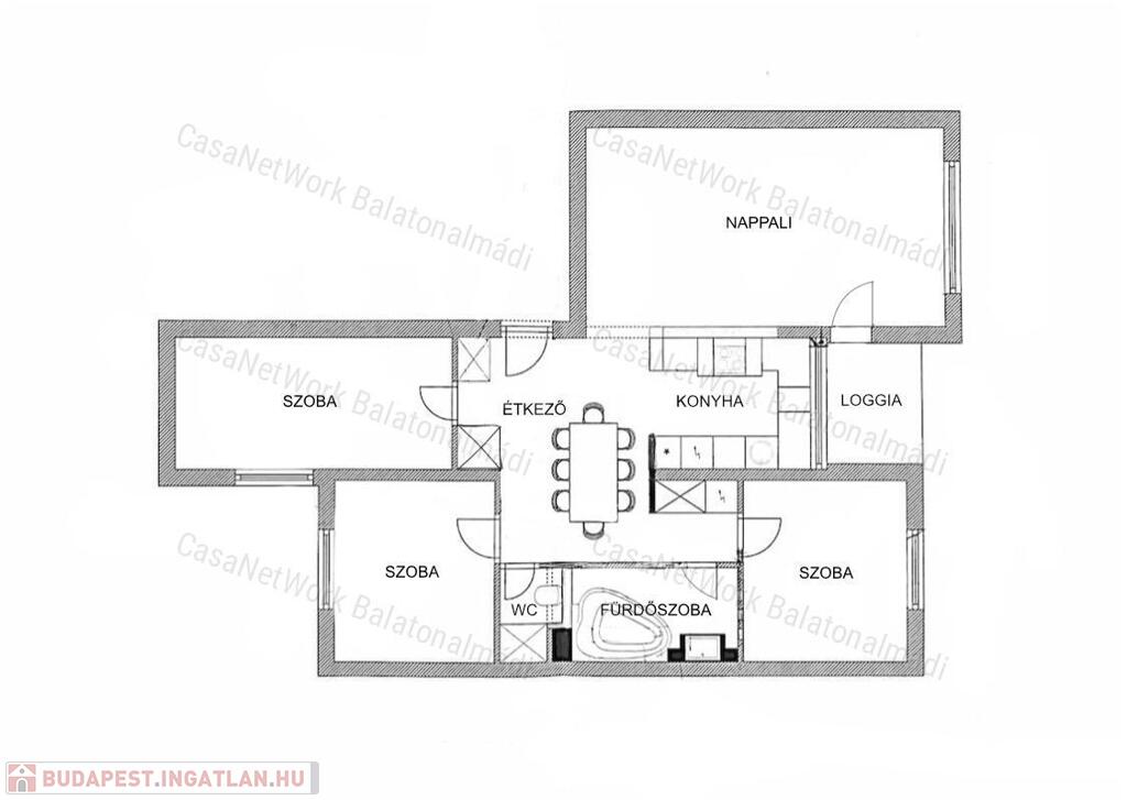 - Ideális kialakítású terek: napfényes nappali, összeköttetésben a konyha-étkezővel, három hálószoba, fürdőszoba, toalett és loggia