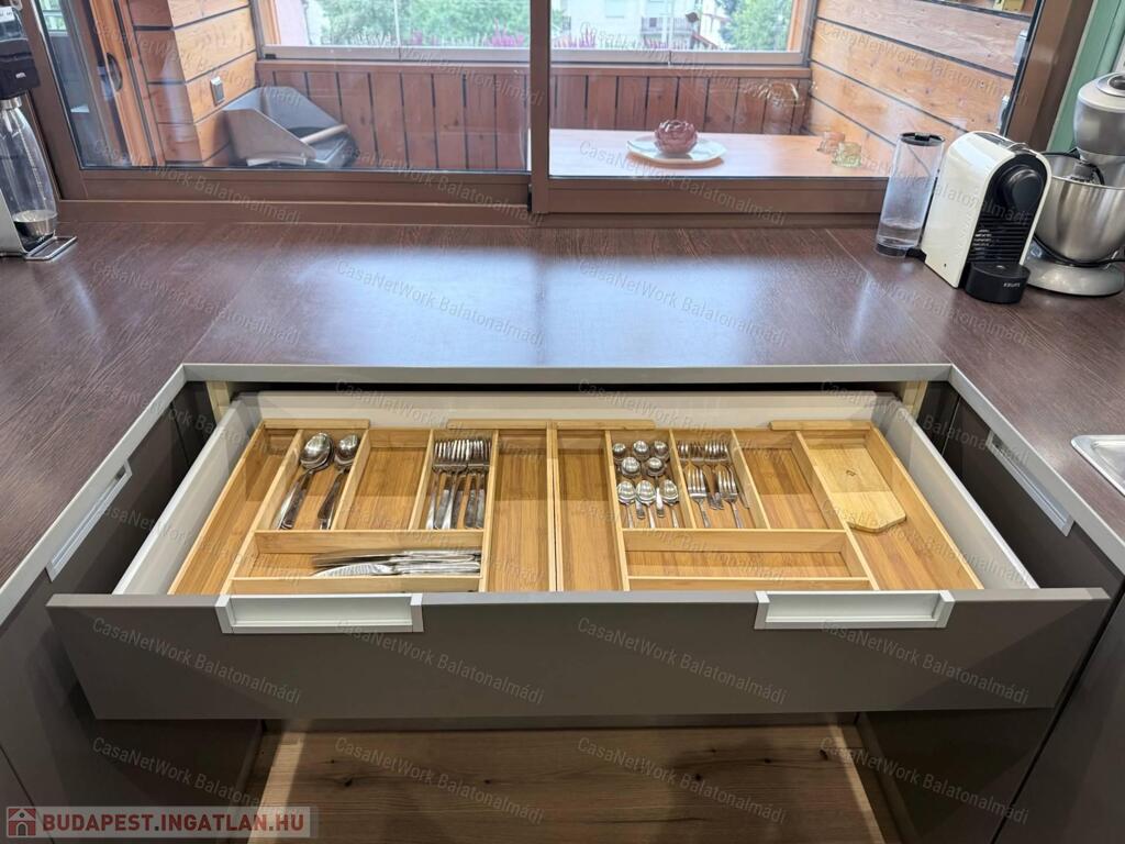 zöldségmosó, üvegburkolat az alsó és felső szekrények között, tolóablak a loggia irányába.