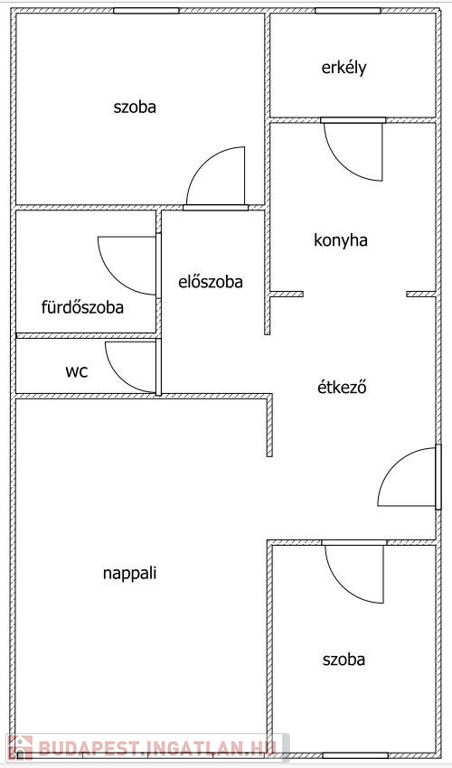 A lakás alapterülete 62 m², elosztása praktikus és élhető. Helyiségei: előszoba, nappali, konyha, étkező, 2 hálószoba, fürdőszoba, külön WC, valamint egy 4 m²-es erkély. A konyha melletti fal részleges bontásával tágas étkezőt alakítottak ki, amelyet egy elektromos látványkandalló tesz különösen hangulatossá.