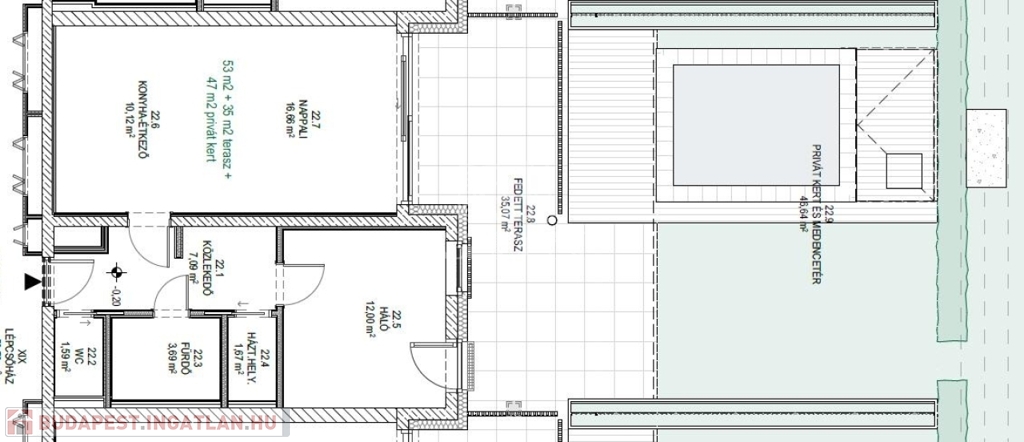 Ez a lakás nappali+1 hálós, 53nm alapterületű+ tartozik hozzá egy 35nm-es fedett terasz és 47nm privát kert is.