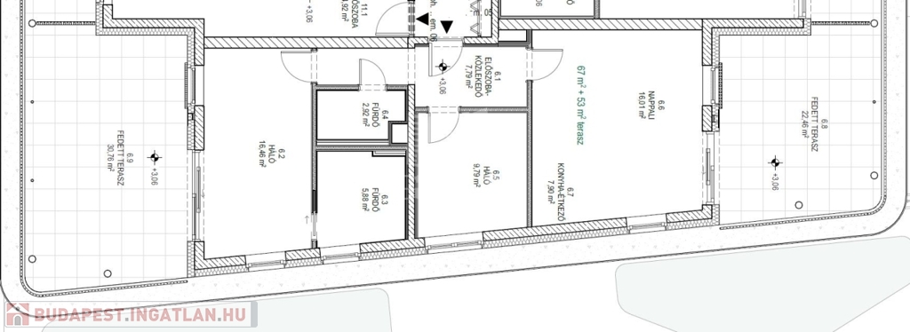 Ez a lakás nappali+2 hálós, 67nm alapterületű+ tartozik hozzá két (22nm+31nm) összesen 53nm fedett terasz is.