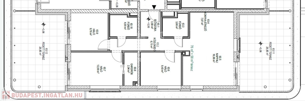 Ez a lakás nappali+3 hálós, 76nm alapterületű+ tartozik hozzá két (29nm+29nm) összesen 58nm fedett terasz is.