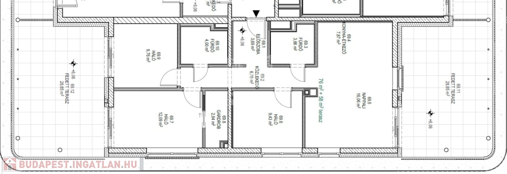 Ez a lakás nappali+3 hálós, 76nm alapterületű+ tartozik hozzá két (29nm+29nm) összesen 58nm fedett terasz is.