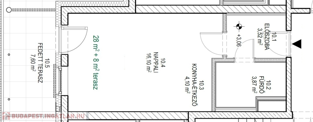 Ez a garzonlakás 28nm alapterületű+ tartozik hozzá egy 8nm-es fedett terasz is.