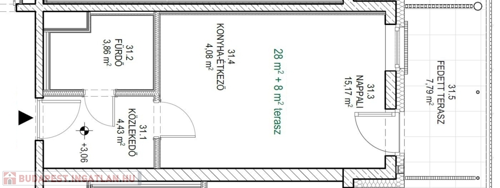 Ez a garzonlakás 28nm alapterületű+ tartozik hozzá egy 8nm-es fedett terasz is.
