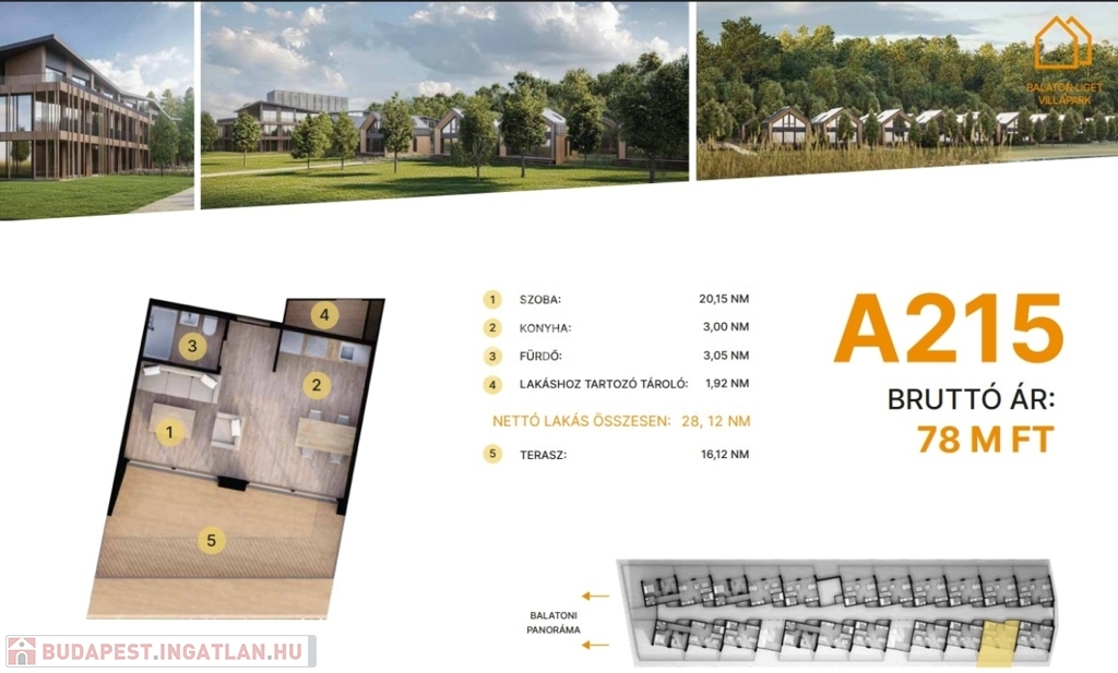 Az első emeleten további 21 lakás érhető el, 47–75 m² közötti méretben.