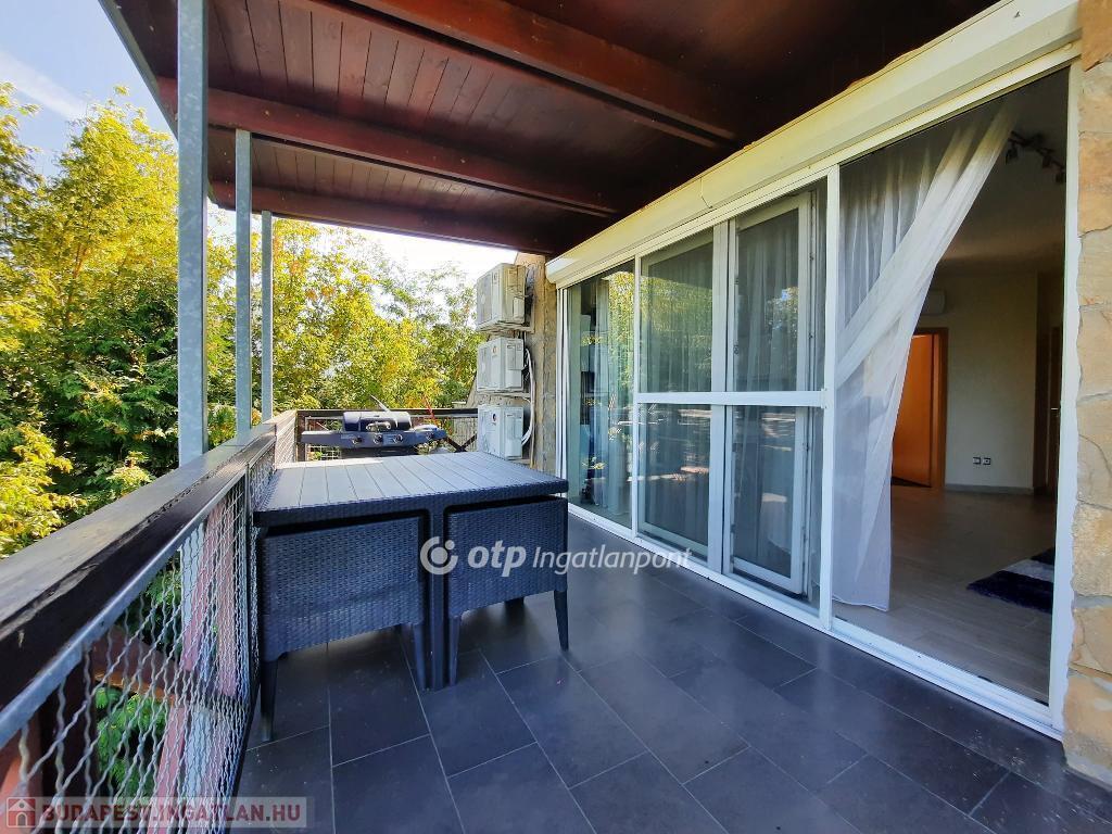 Az ingatlan elrendezése praktikus és élhető: amerikai konyhás nappali, két hálószoba, fürdőszoba és előszoba található benne, valamint egy terasz, ahonnan kilátás nyílik a Balatonra. A lakás északi fekvésű, világos, kellemes klímájú, egész évben jól használható. A fűtésről egyedi gáz-cirkó rendszer gondoskodik, a szobákban és a nappaliban pedig inverteres hűtő-fűtő klímaberendezés is található. Minden közmű egyedi mérőórával rendelkezik.