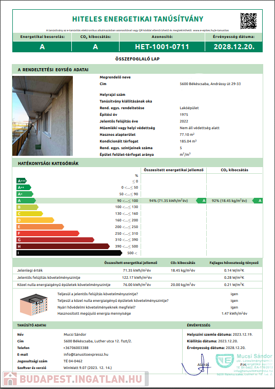 Az ingatlan HITELES ENERGETIKAI TANÚSÍTVÁNY-al rendelkezik (HET-1001-0711), amely alapján az ingatlan energetikai besorolása: A