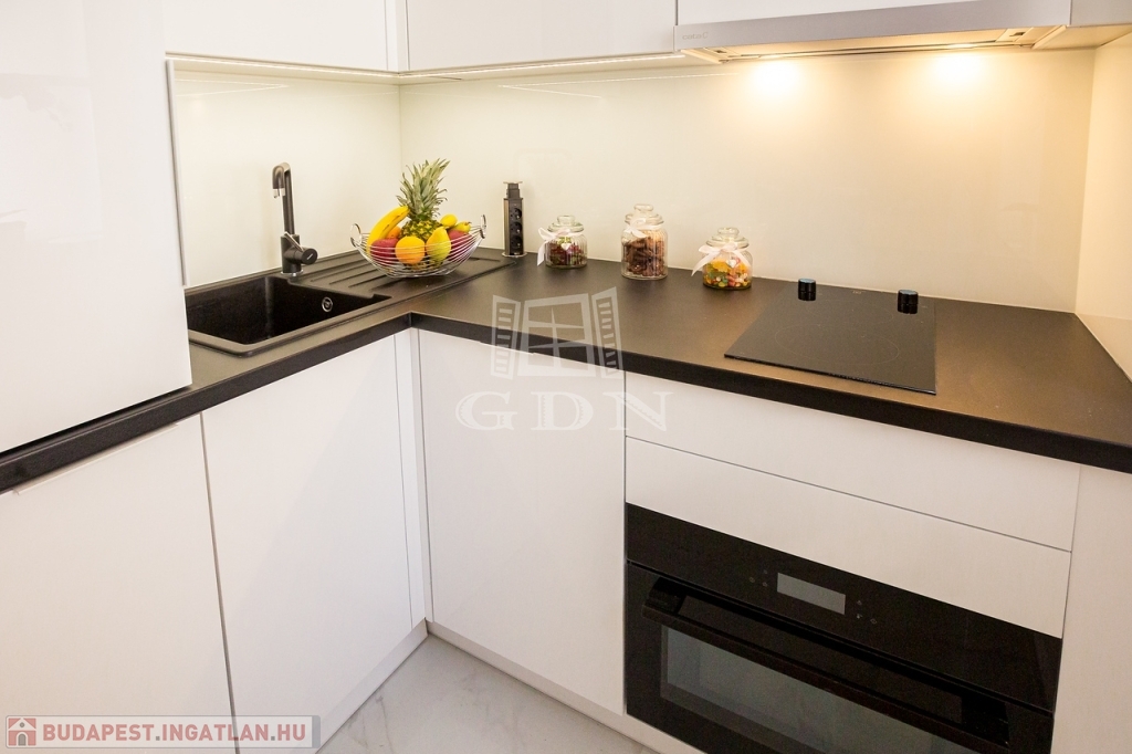 A modern konyha kompakt, mindennel felszerelt, a mosógép is itt kapott helyet. Ablaka a kis belső udvarra néz, világos és könnyen átszellőztethető az egész lakás.